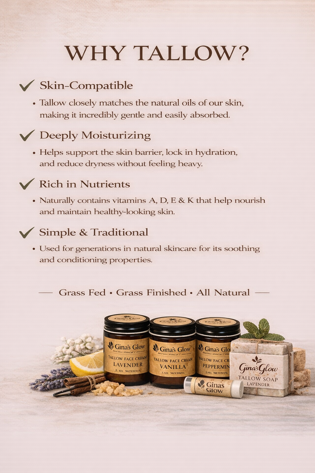 That search ultimately led to grass-fed, grass-finished tallow — a deeply nourishing ingredient known for its remarkable compatibility with the skin.